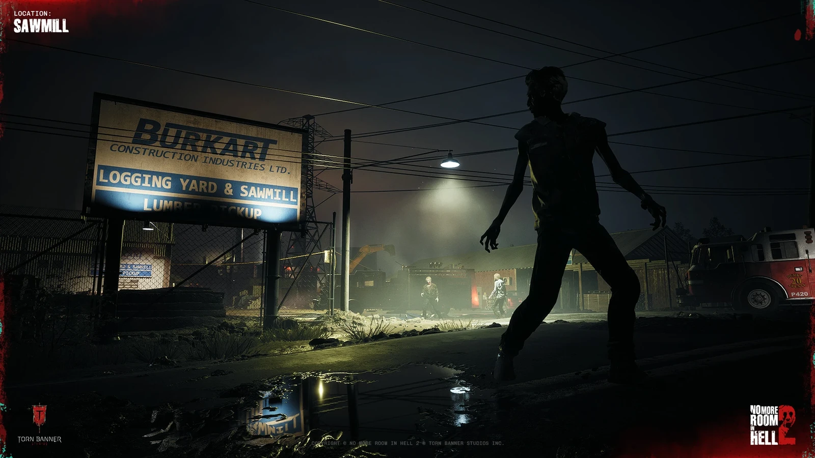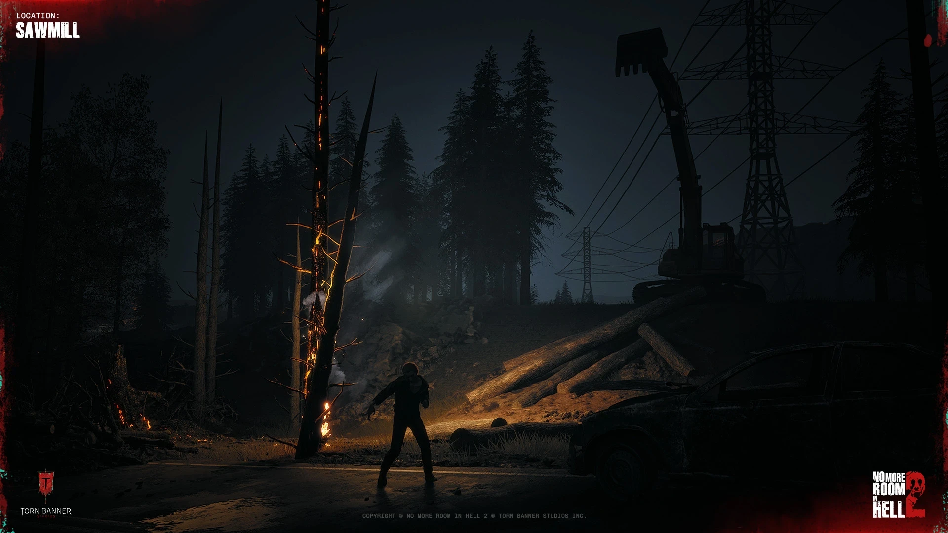 The area is framed around the aftermath of a wildfire response gone wrong, where fire crews were overwhelmed during the early outbreak, leaving behind vehicles, equipment, and signs of a desperate last stand as the situation collapsed.